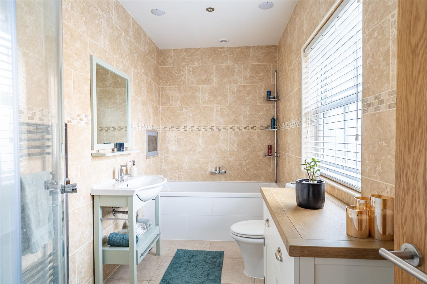 Bathroom has TV and surround sound speakers in the ceiling. (TV not connected to the speakers)